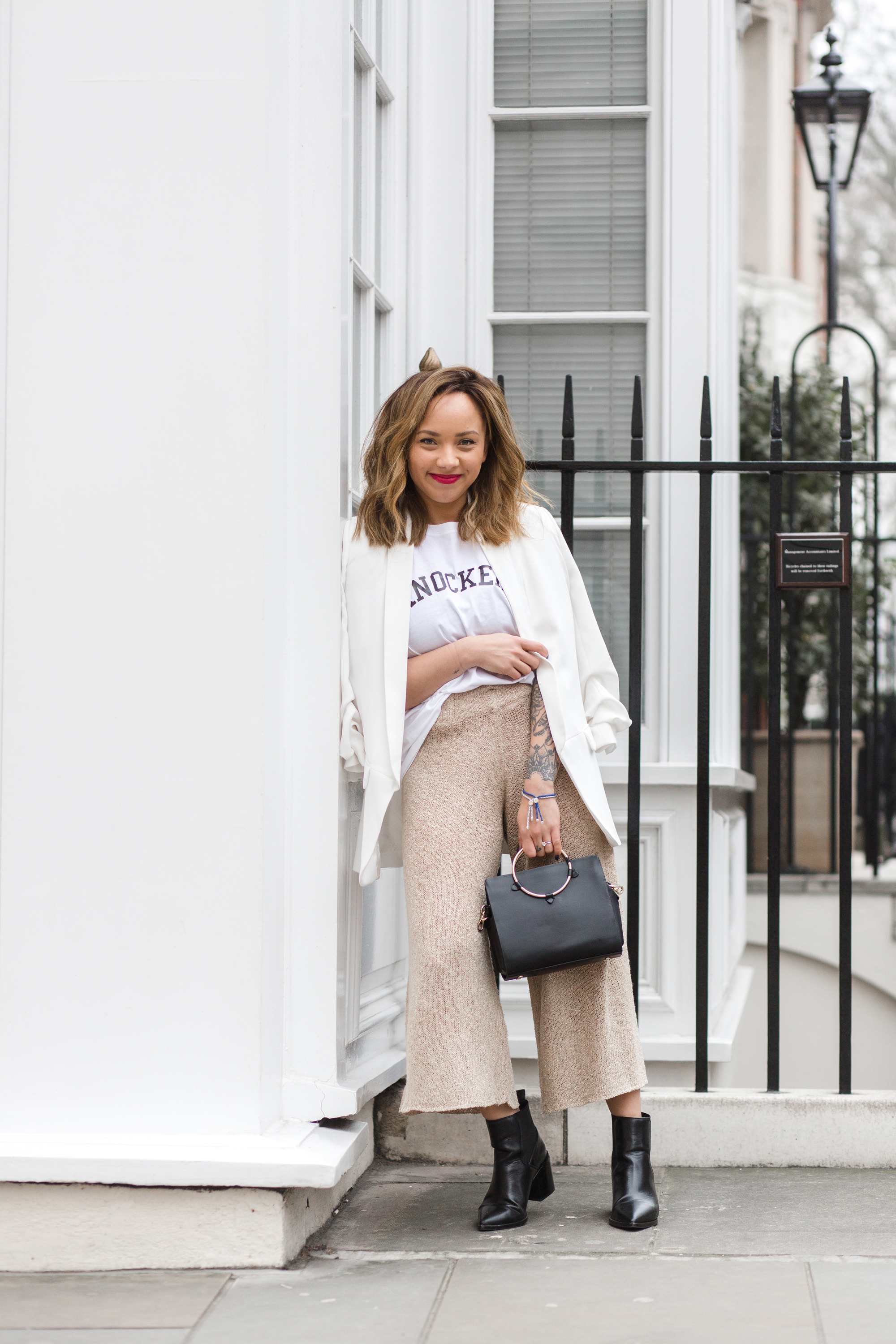 I paired it here with my super comfy trousers from Zara (it basically feels like you’re wearing PJ’s), my heeled chelsea boots and a slouchy fit white blazer which brings back the touch of smartness which the trousers take away a little, being so casual.